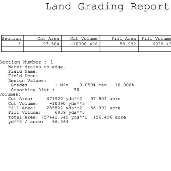 Customers are provided with a detailed grading report which outlines all aspects of the specs to complete the grading work. these include Cut area in acres, Cut Volume, Fill Volume, and slope percentage.